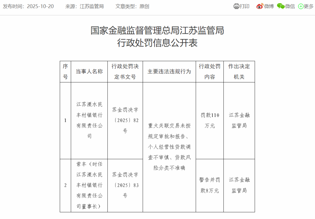 因重大关联交易未按规定审批和报告、个人经营性贷款调查不审慎、贷款风险分类不准确三项主要违法违规行为,江苏溧水民丰村镇银行有限责任公司被江苏金融监管局罚款110万元。